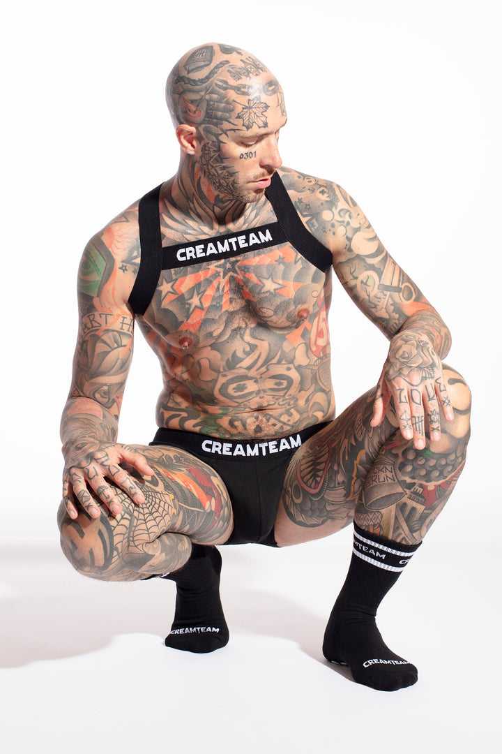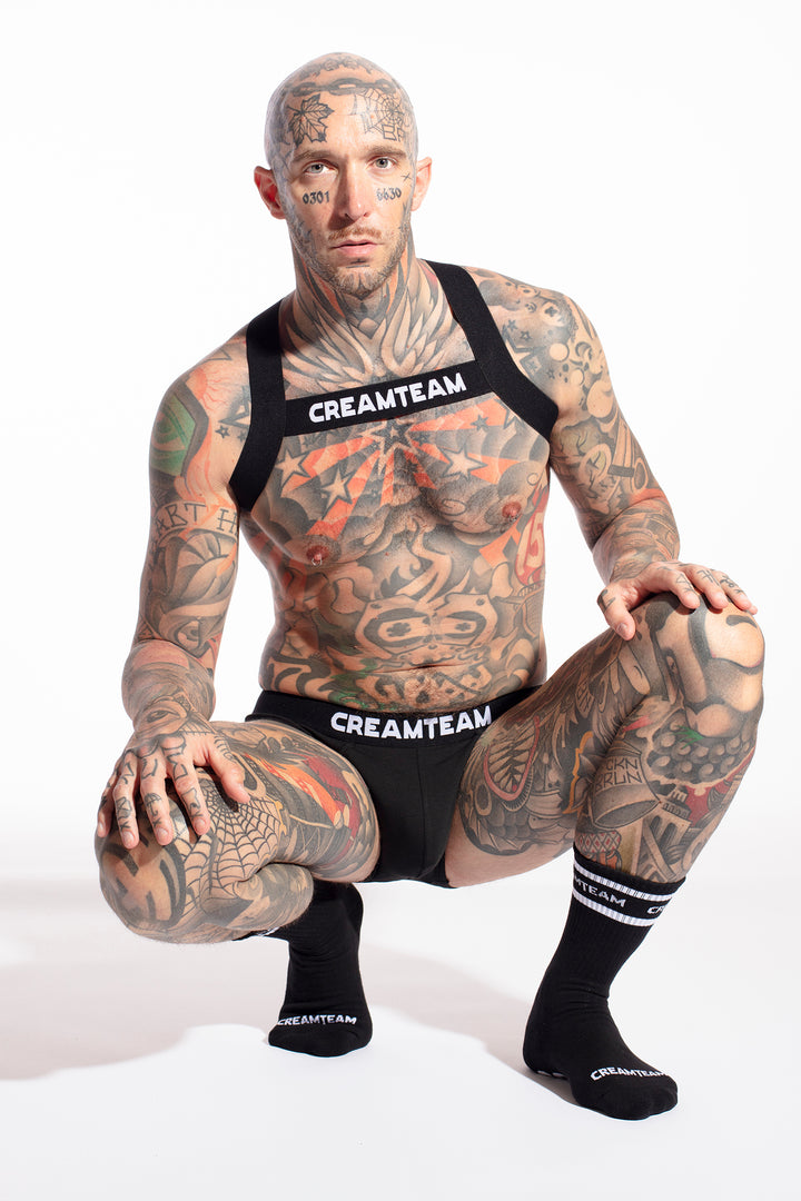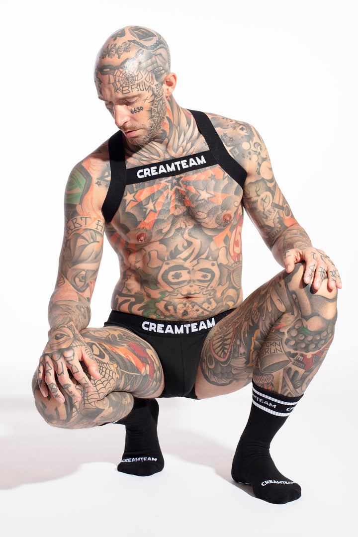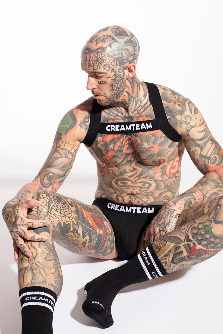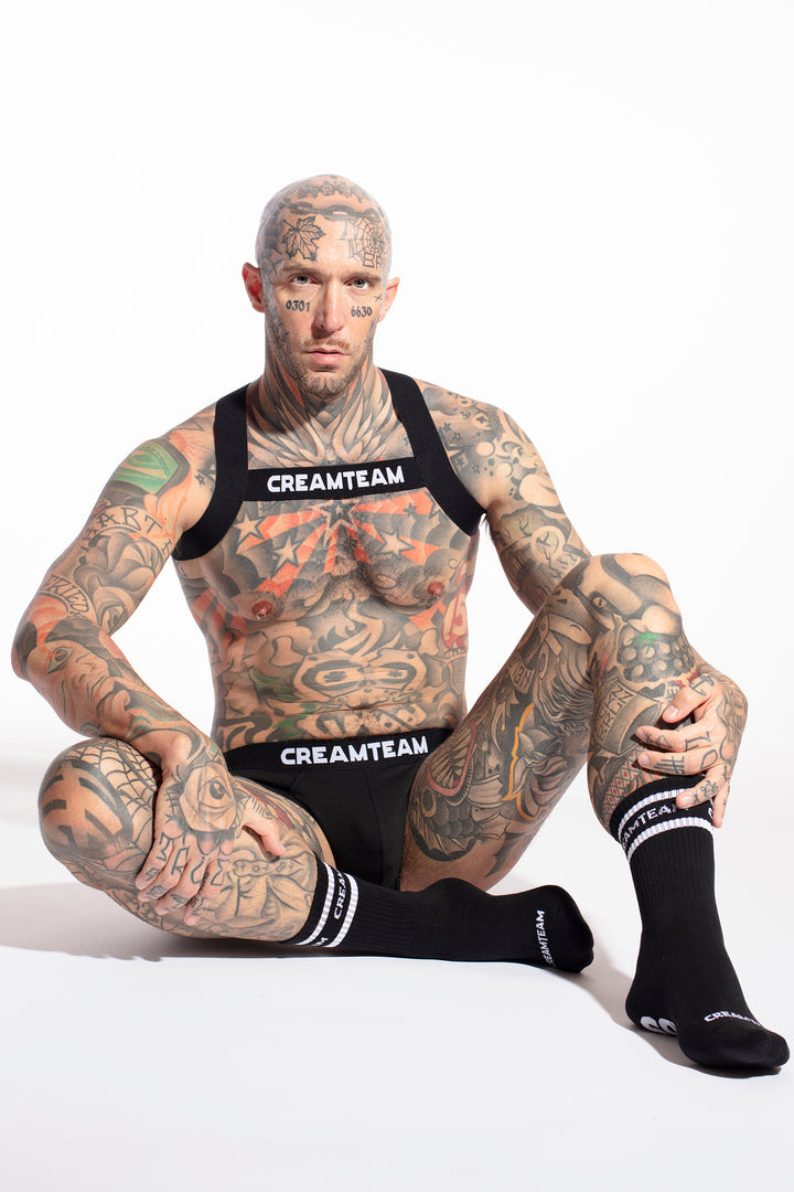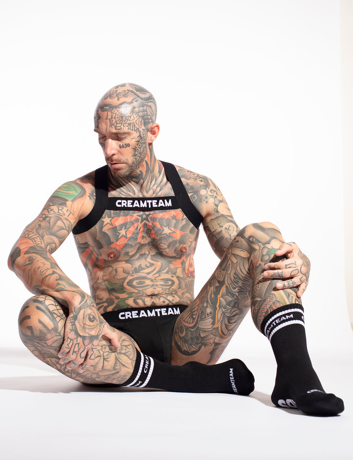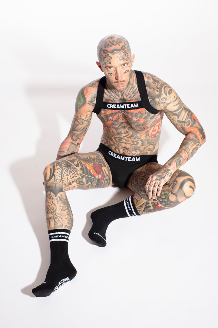 The black brief offers a contoured fit with soft stretch fabric that supports and defines, while the harness wraps your chest in strong, elastic straps that frame your body and amplify your presence. Completing the look is the Loads Sock—soft, snug, and stamped with a cheeky graphic that keeps the energy high from head to toe.