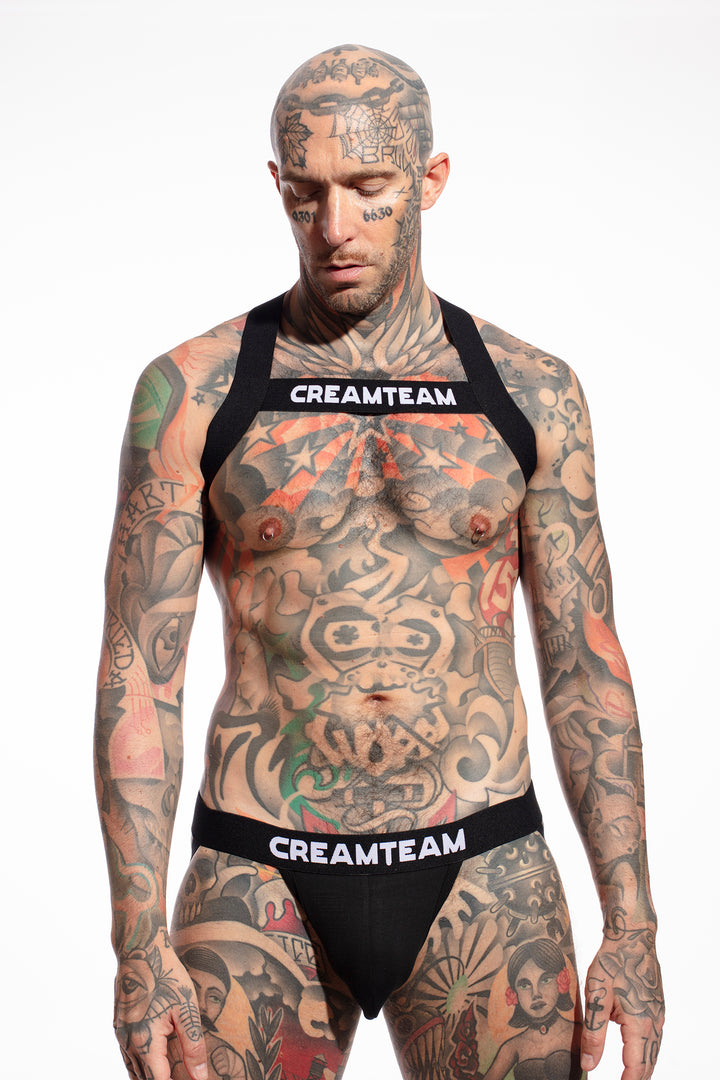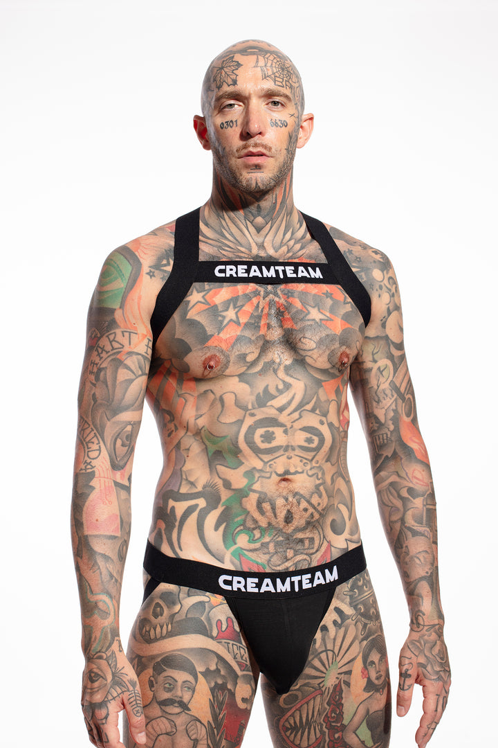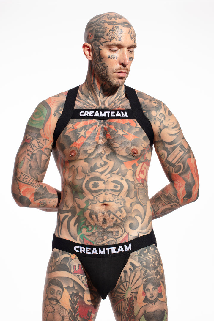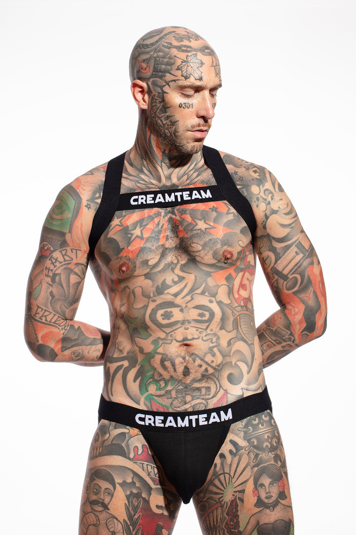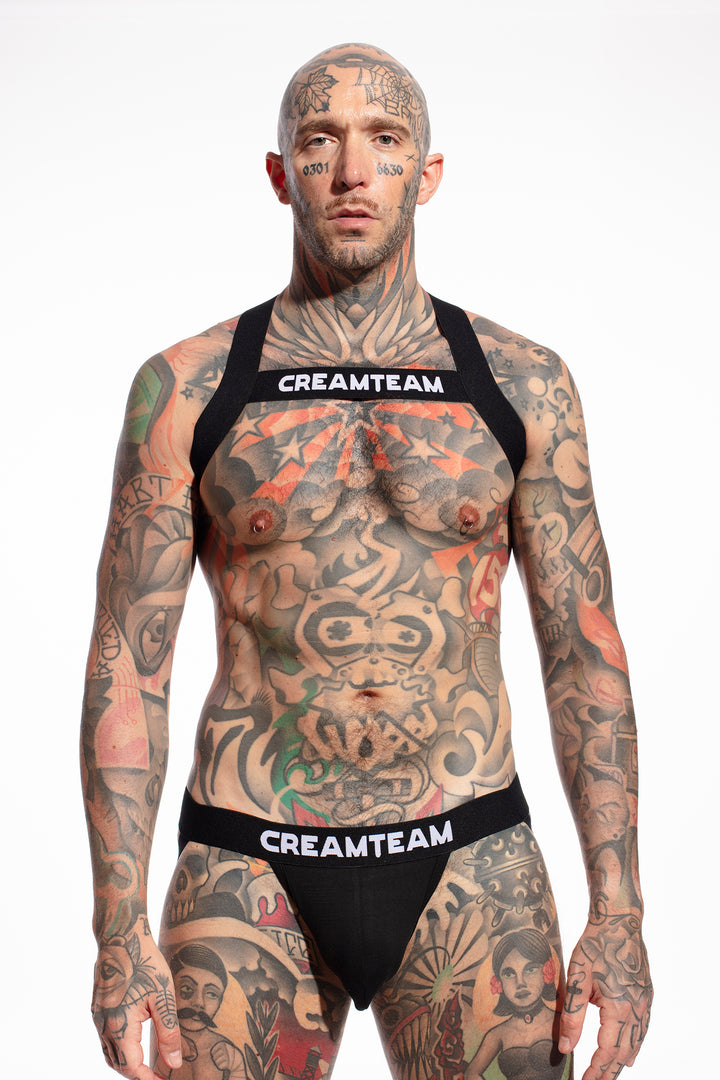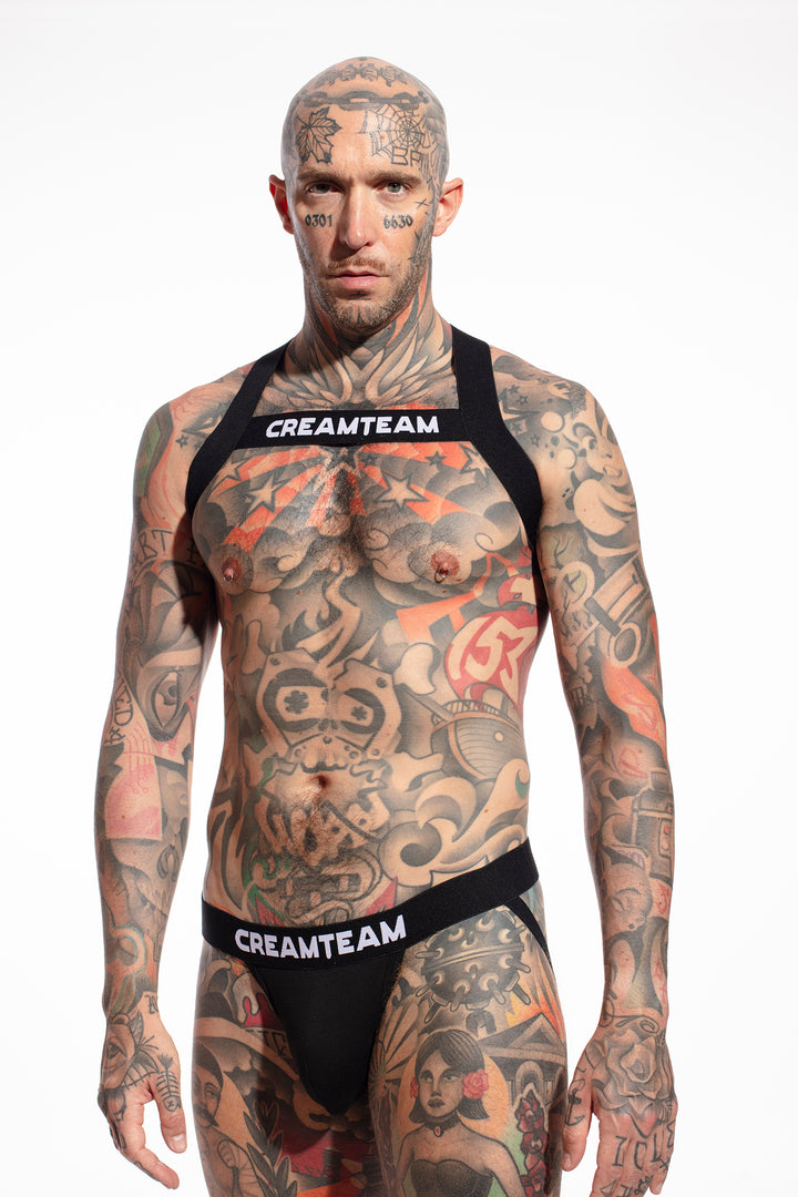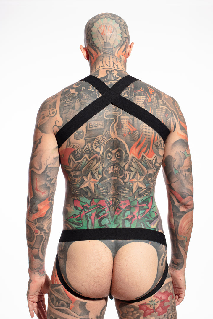 The jock offers a soft, form-fitting pouch with a strong waistband that supports and defines, while the harness wraps your chest in bold, elastic straps that frame your body with confidence. Worn together or solo, this set is made to move, seduce, and dominate.