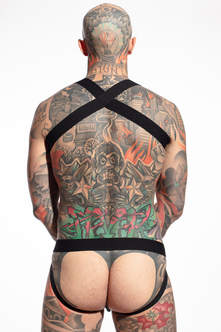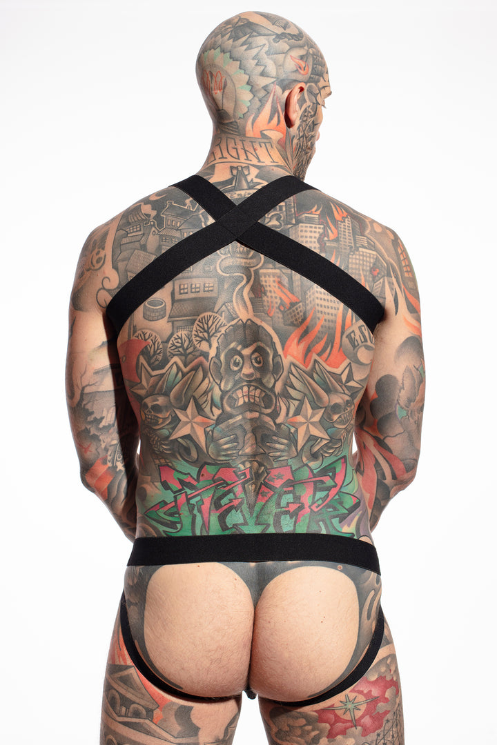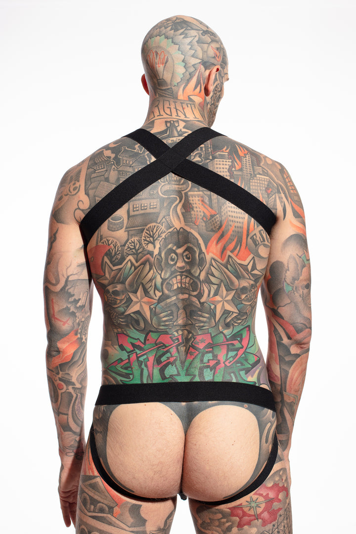 Available in sizes S–XXL (jock) and S/M or L/XL (harness) for a striking fit that holds nothing back.