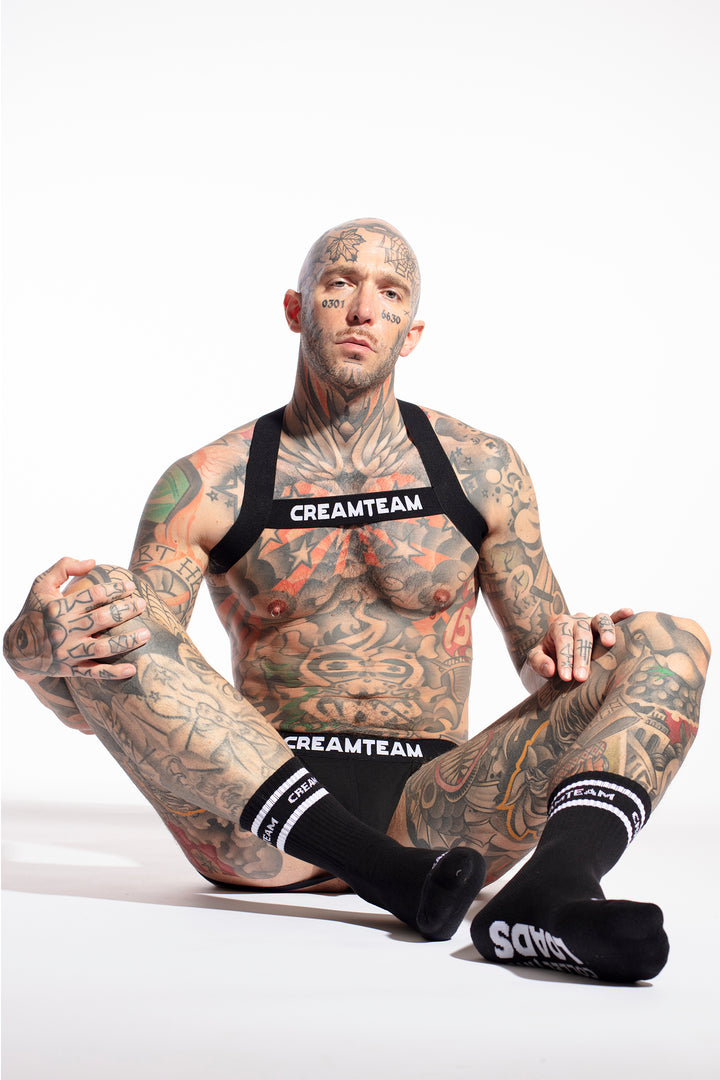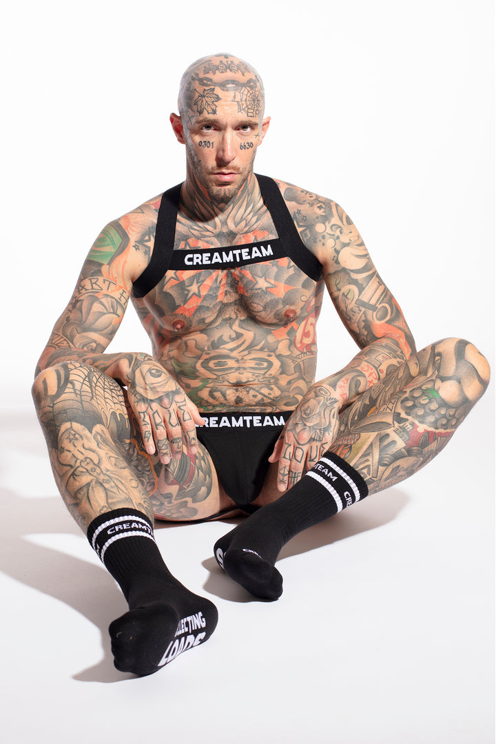 The jock delivers comfort and edge with its “Loads” print pouch, soft-touch fabric, and a strong waistband for lift and definition. The matching harness wraps the chest in bold, elastic straps that sculpt your frame and demand attention. Paired with the Loads Sock—soft, snug, and playfully provocative—this set is made to tease and dominate.